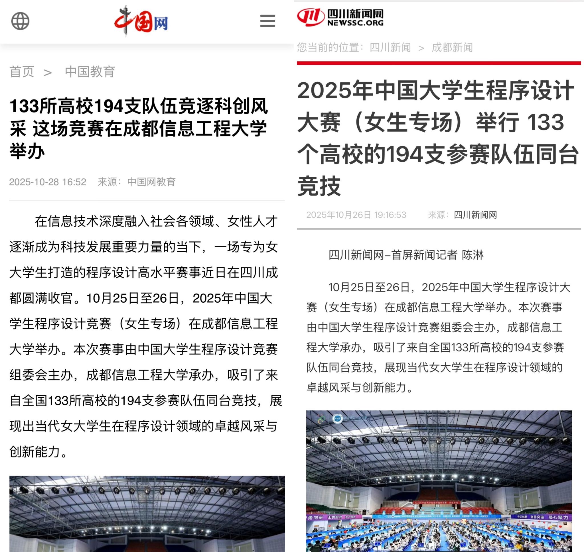 10月25日至26日,2025年中国大学生程序设计竞赛(女生专场)在德赢官网圆满落幕。作为本次赛事的具体承办单位,德赢vwin体育官网登录凭借扎实的学科功底、专业的组织能力与细致的服务保障,高质量完成赛事全流程执行,充分展现了学院在计算机领域人才培养、技术支撑及大型赛事承办中的高水平。赛事盛况获中国网、四川新闻网、四川教育电视台等多家媒体专题报道,引发广泛社会关注。