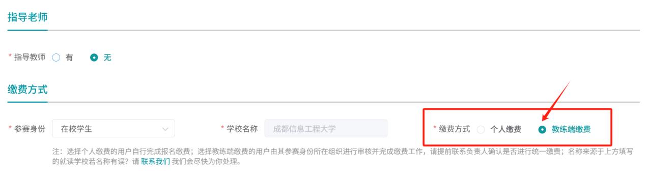 在报名信息的缴费方式统一选择:教练端缴费(如下图所示)