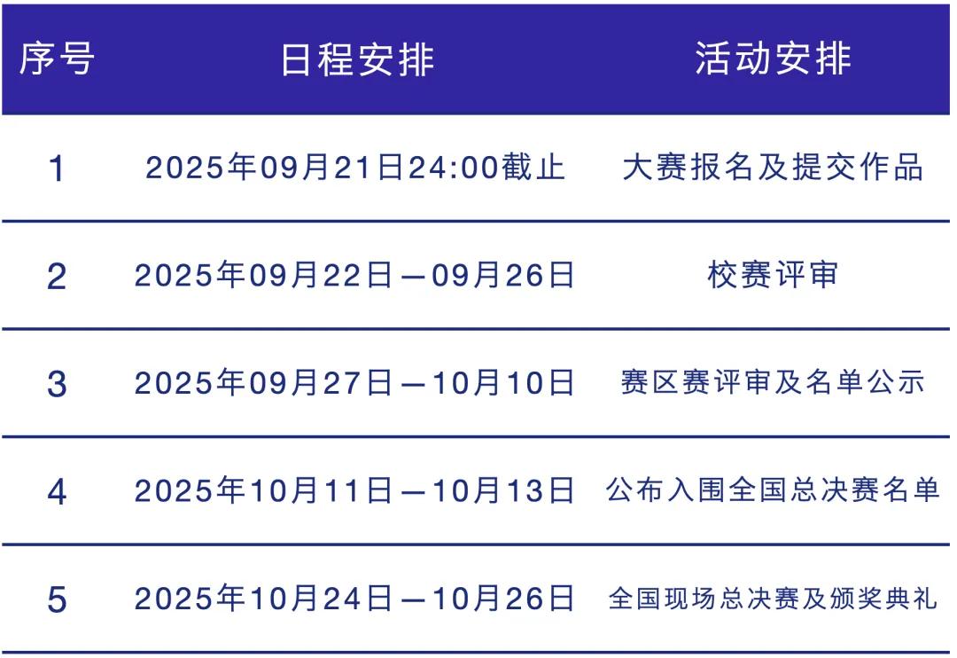 2025年整体赛事工作部署,赛程分为:校赛、赛区赛(原省赛)及全国总决赛三个阶段。